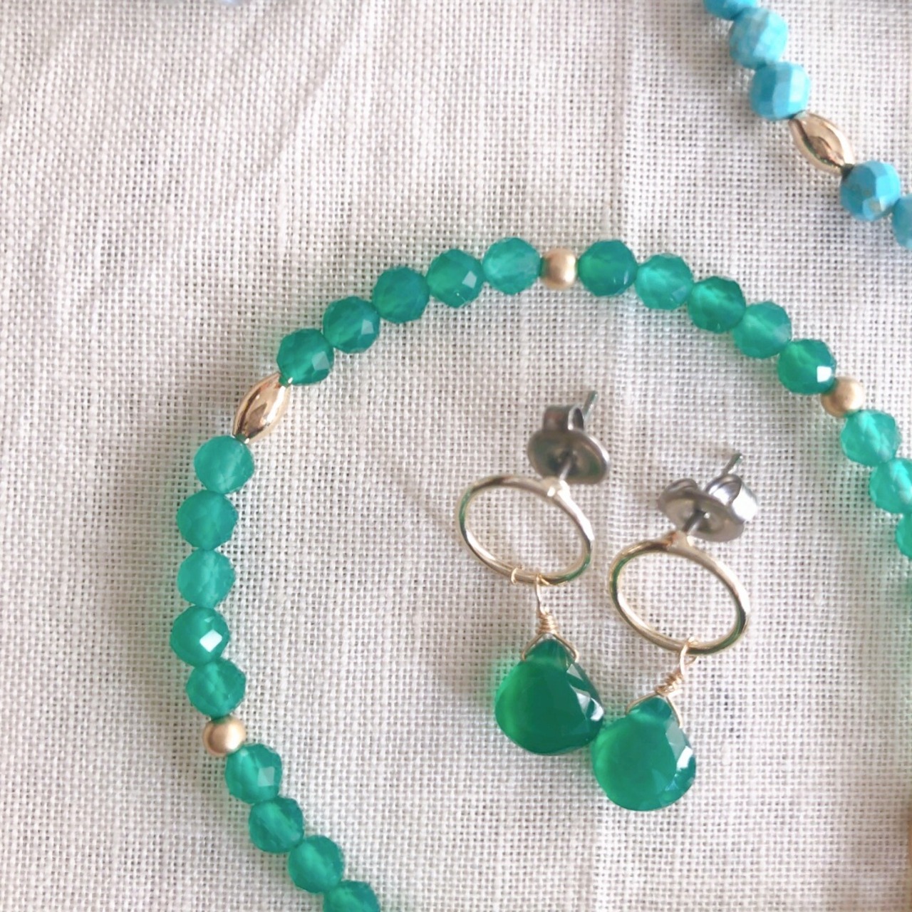 グリーンオニキスを使ったピアスやネックレスもご用意していますので、ぜひお揃いでどうぞ。