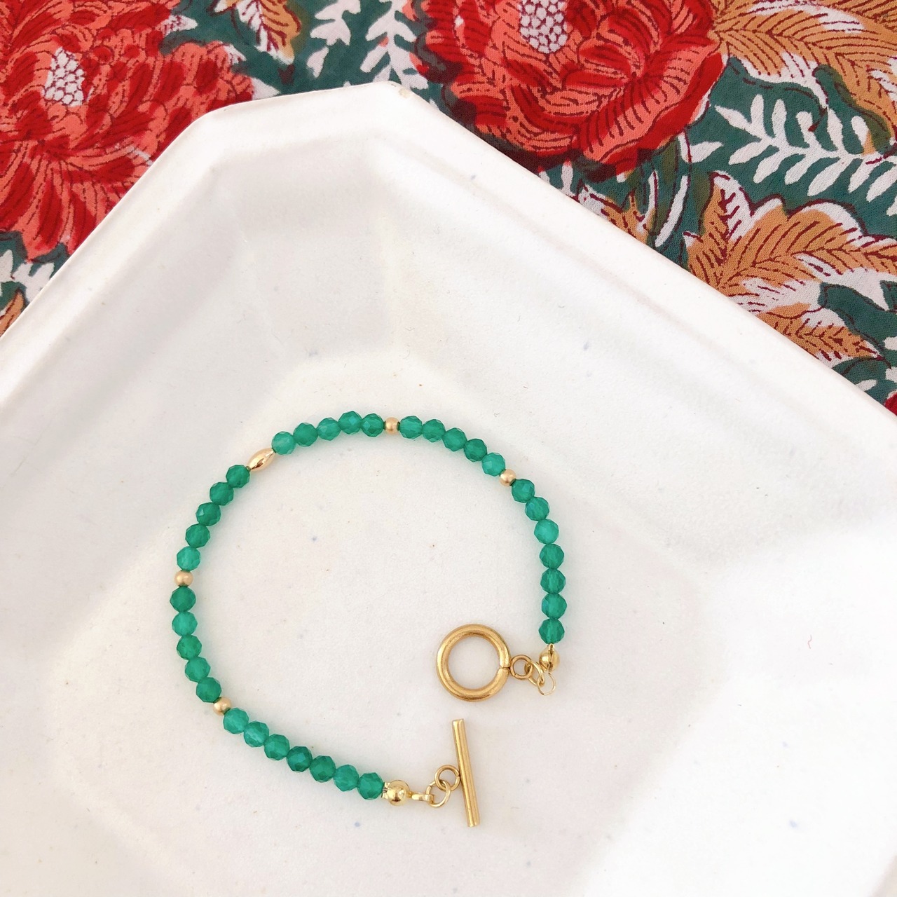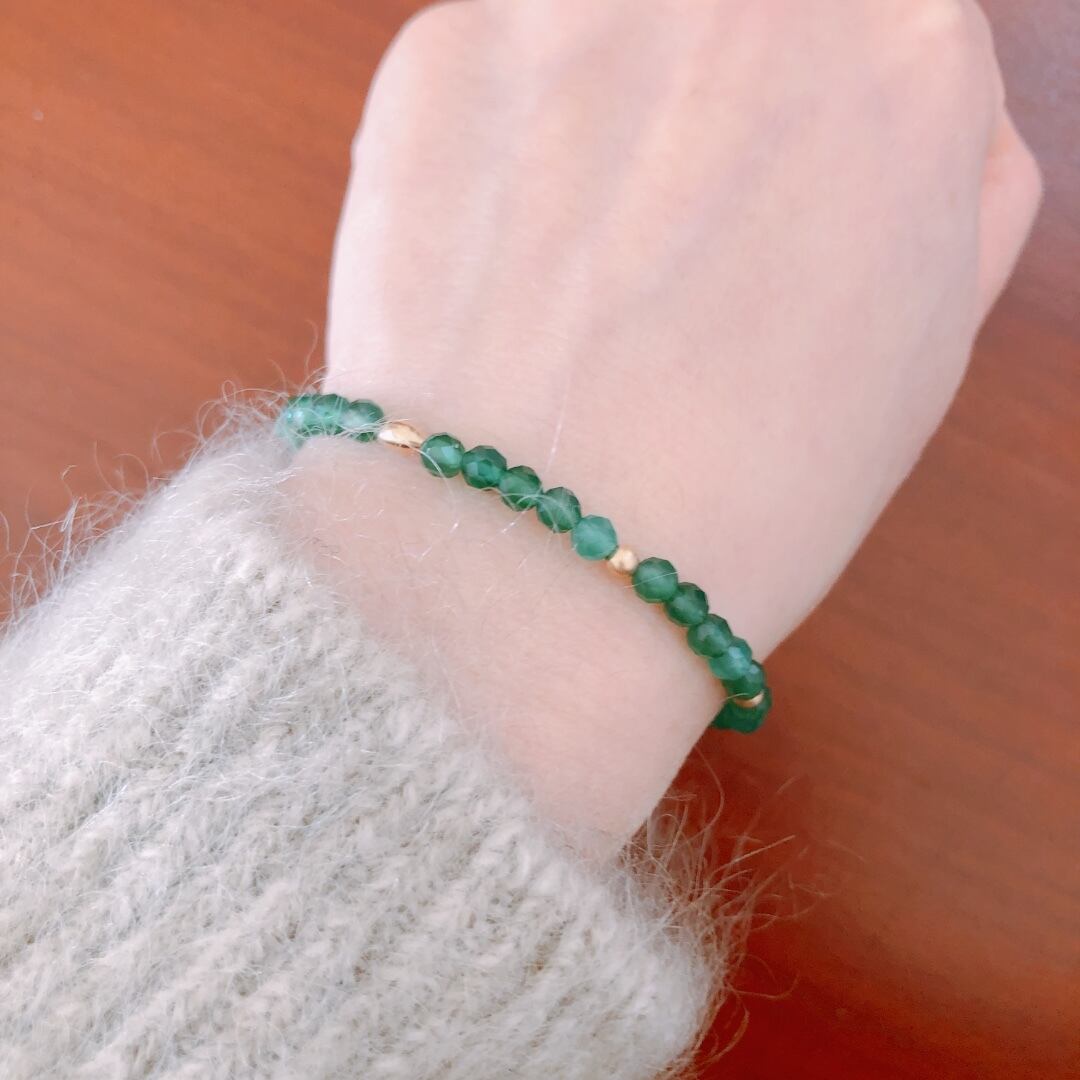 グリーンオニキスの明るく透明感のある緑色は、意外とどんなスタイルにも馴染みやすく、コーディネートを新鮮に見せてくれます。