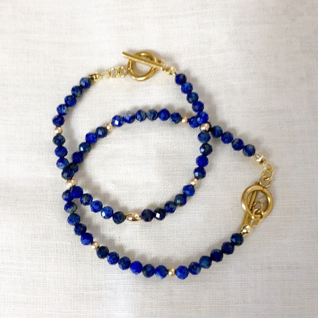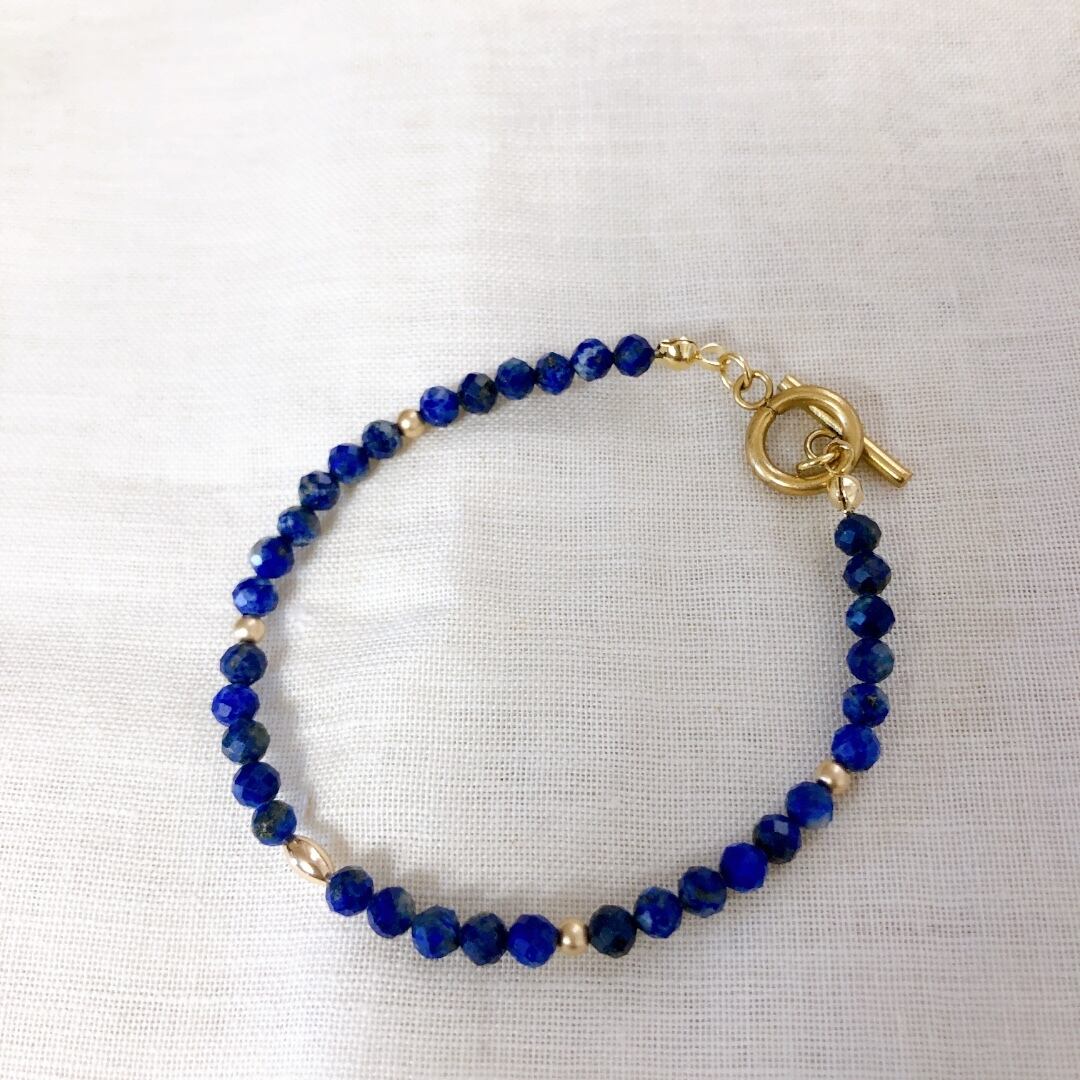 <素材>天然石(ラピスラズリ)、K14GF(ゴールドビーズ)、サージカルステンレス(留め具)