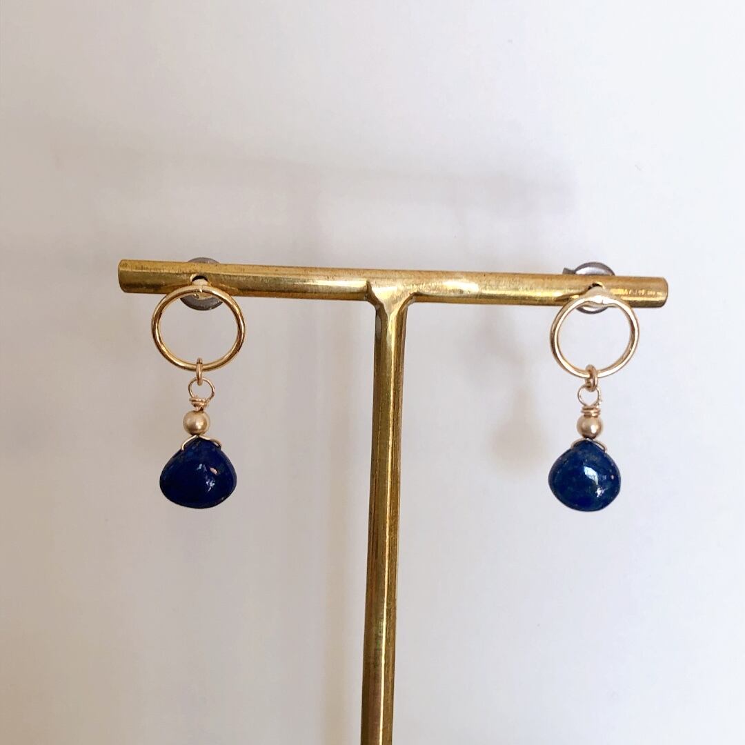 サークルモチーフのパーツからぶら下がっている、ラピスラズリのシンプルなピアス。