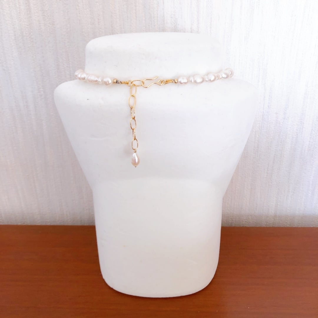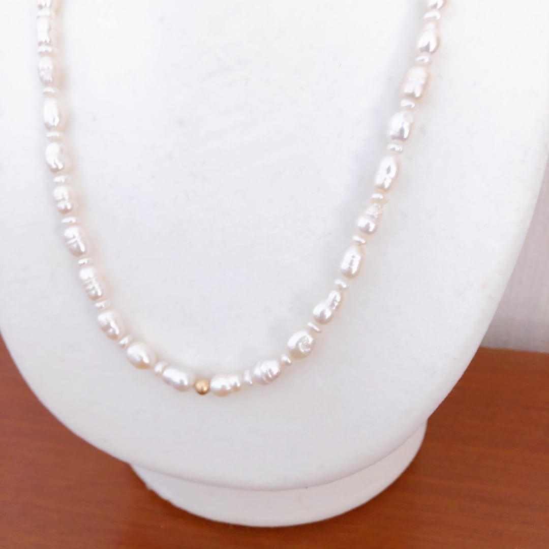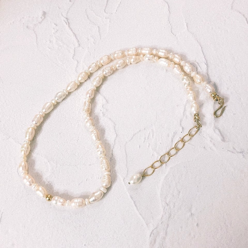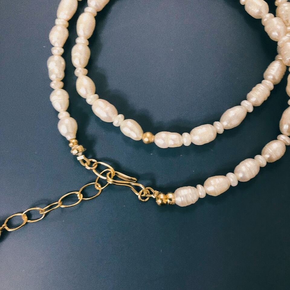 縦長のバロック淡水パールと小さなボタン型の淡水パールを交互につないだネックレス。