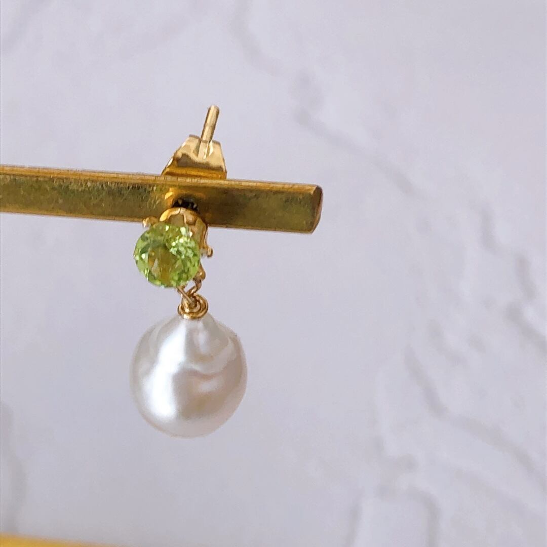 雫型の淡水パールに、明るい黄緑色の石ペリドットのルースを組み合わせた、シンプルなスタッドピアス。
