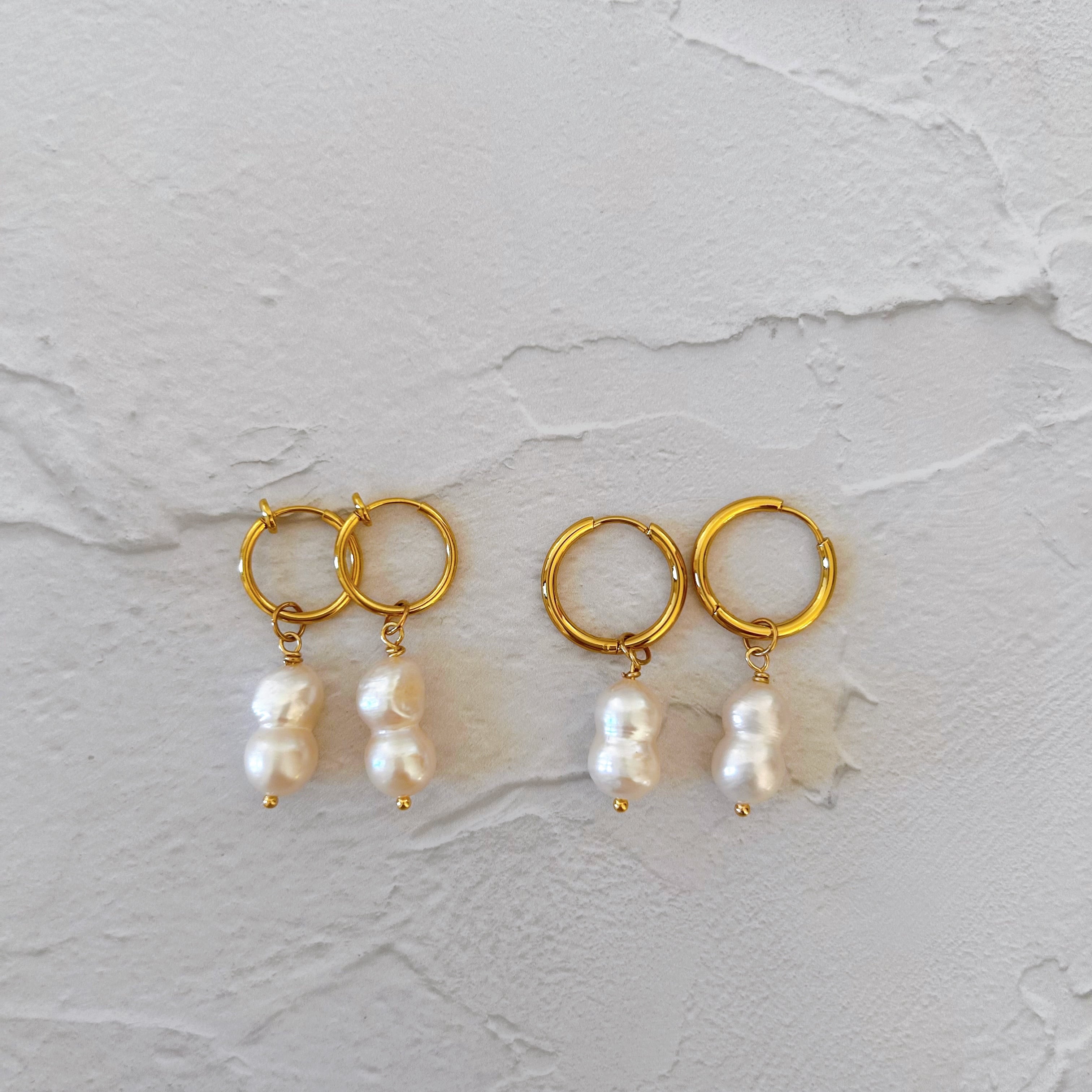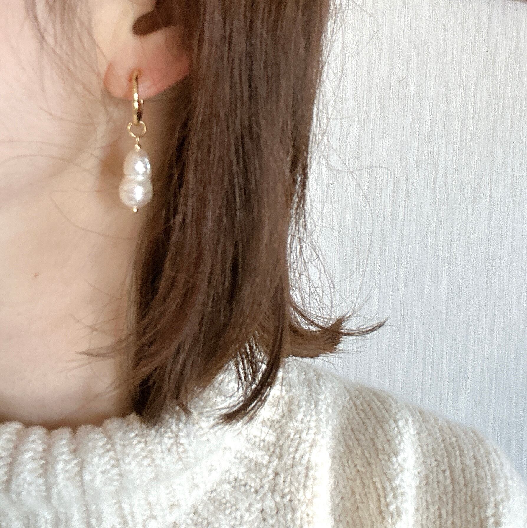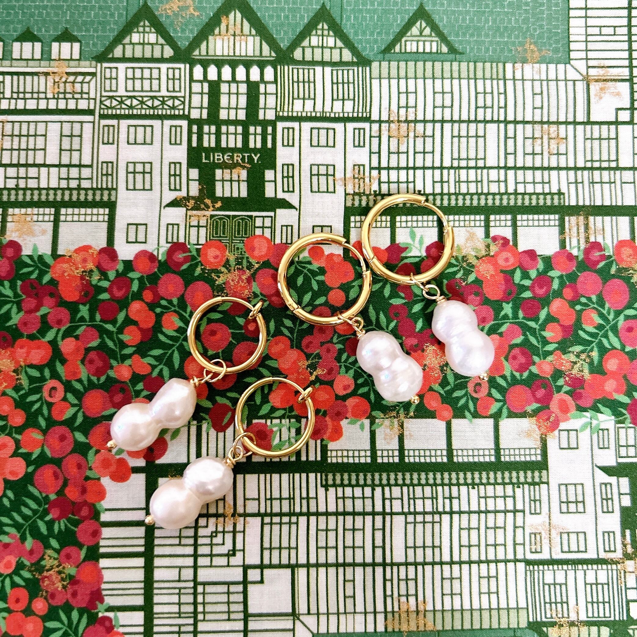 雪だるまのような、ピーナッツのような、ひょうたんのような?ユニークな形が愛らしい、ふたごの淡水パールを取り外しできるフープピアス(イヤリング)に仕立てました。
