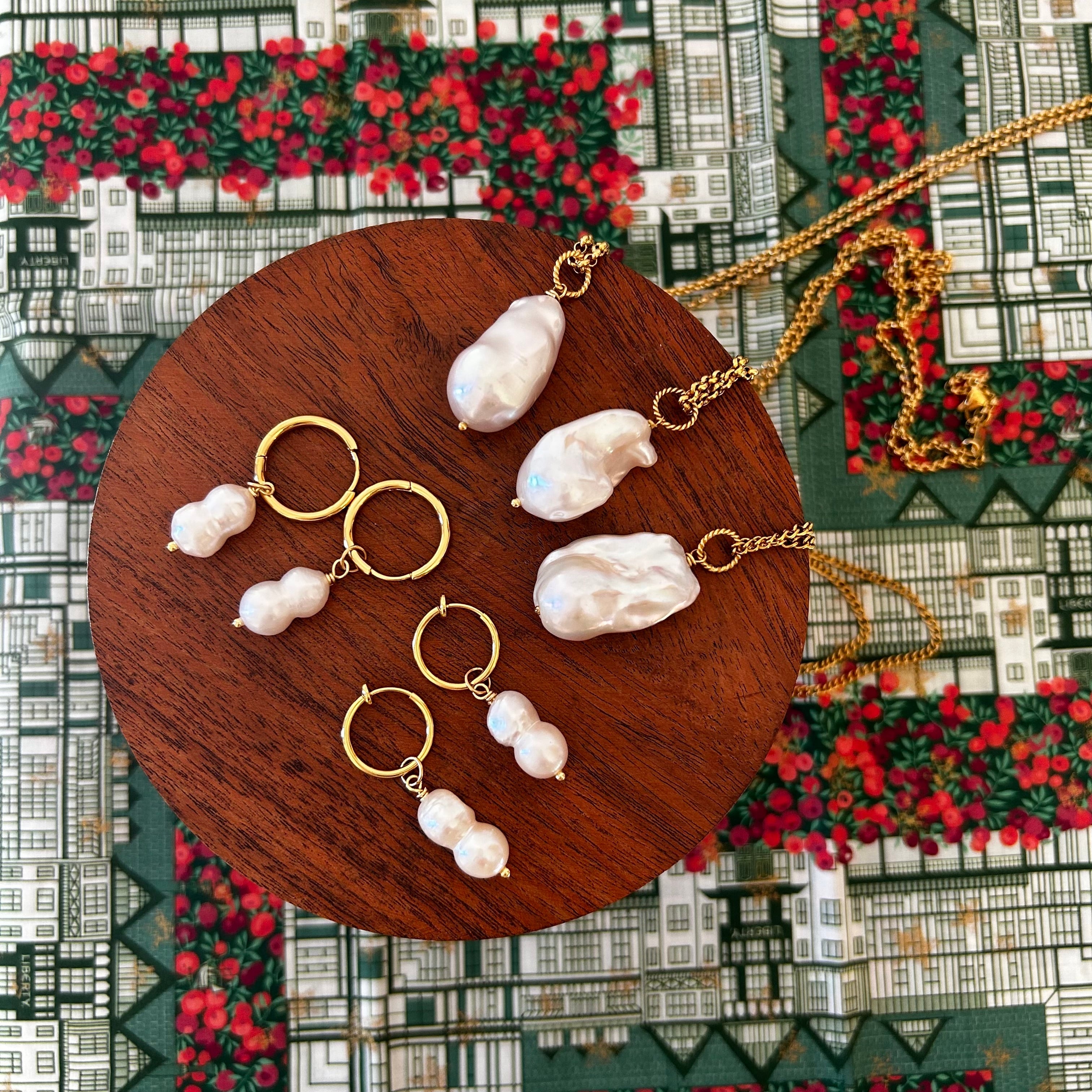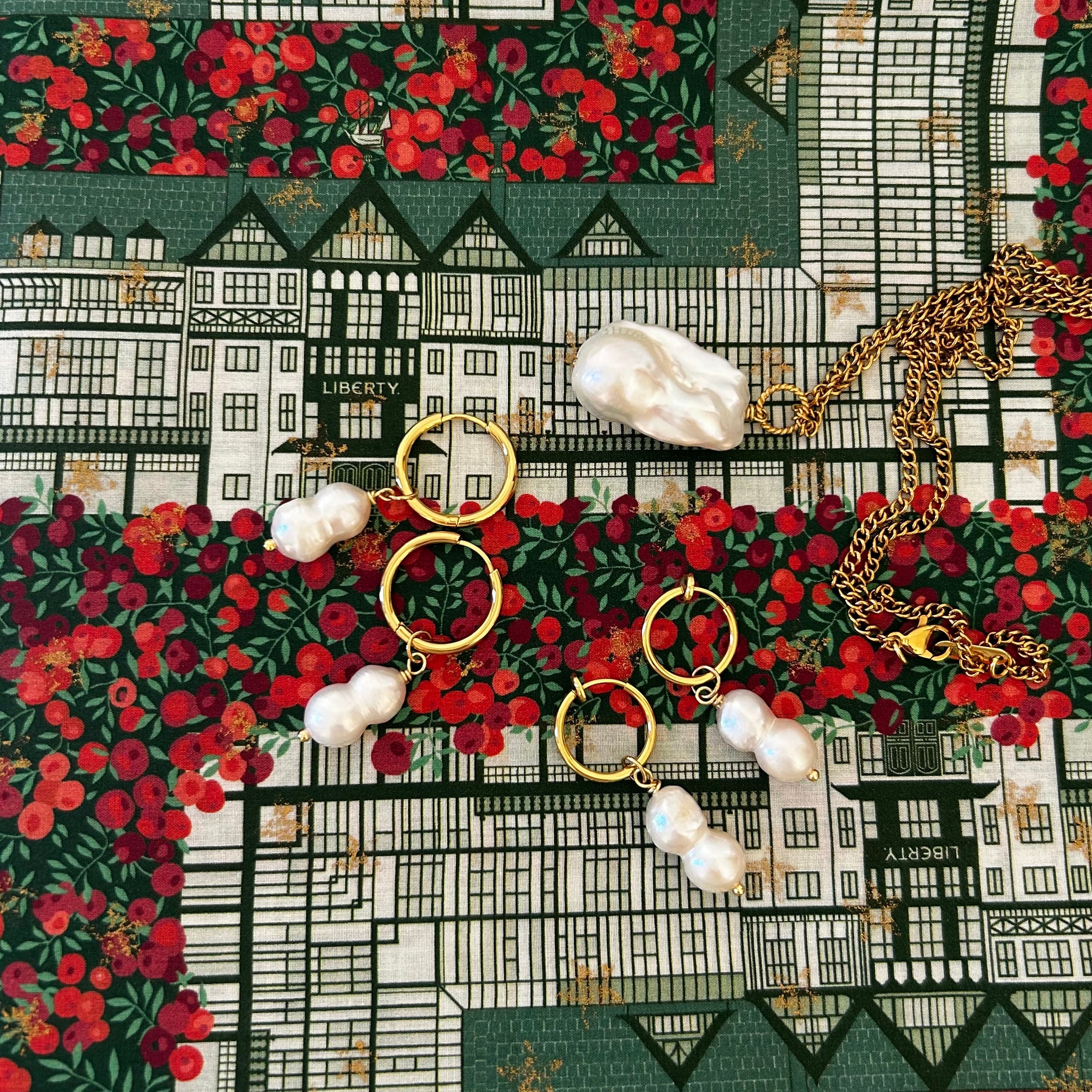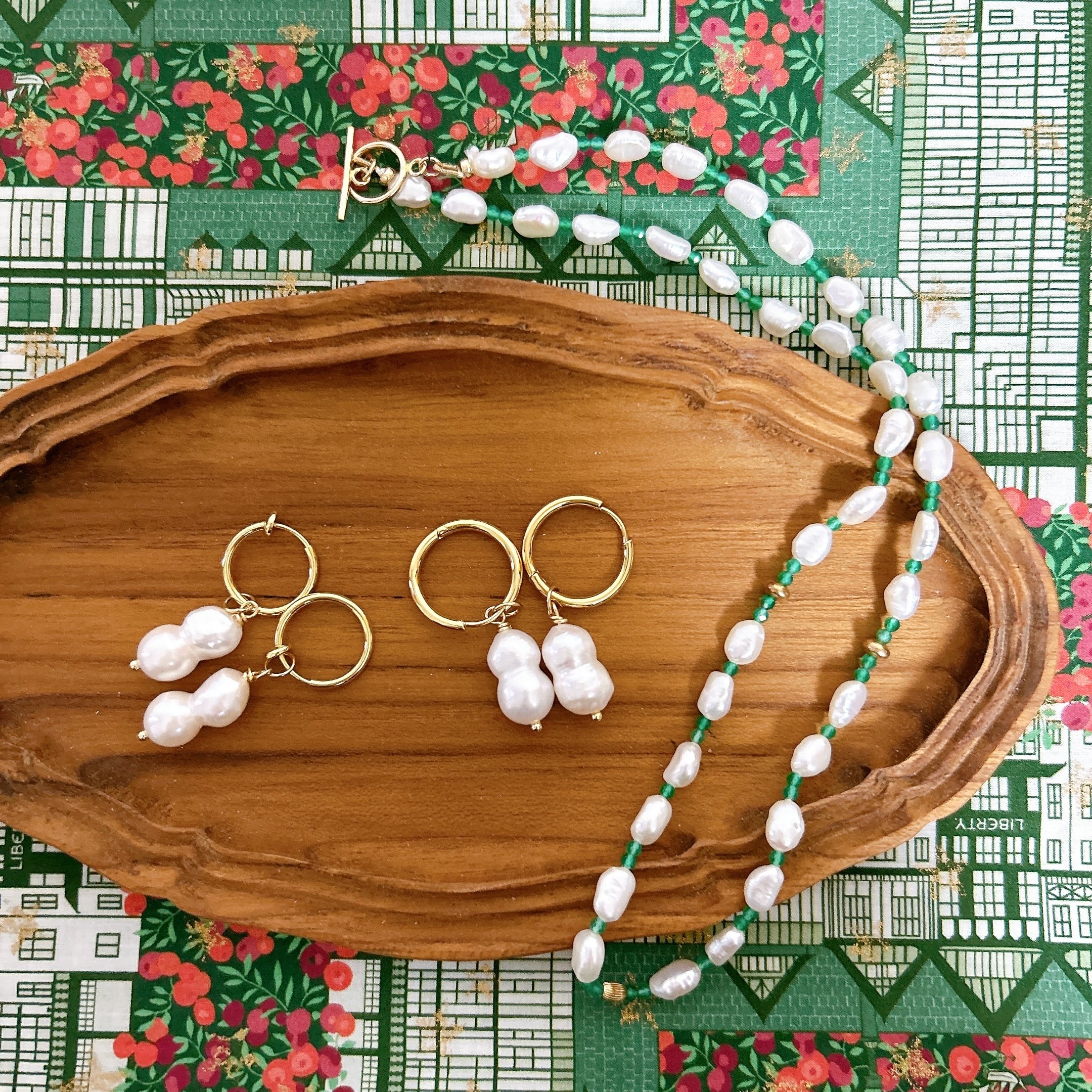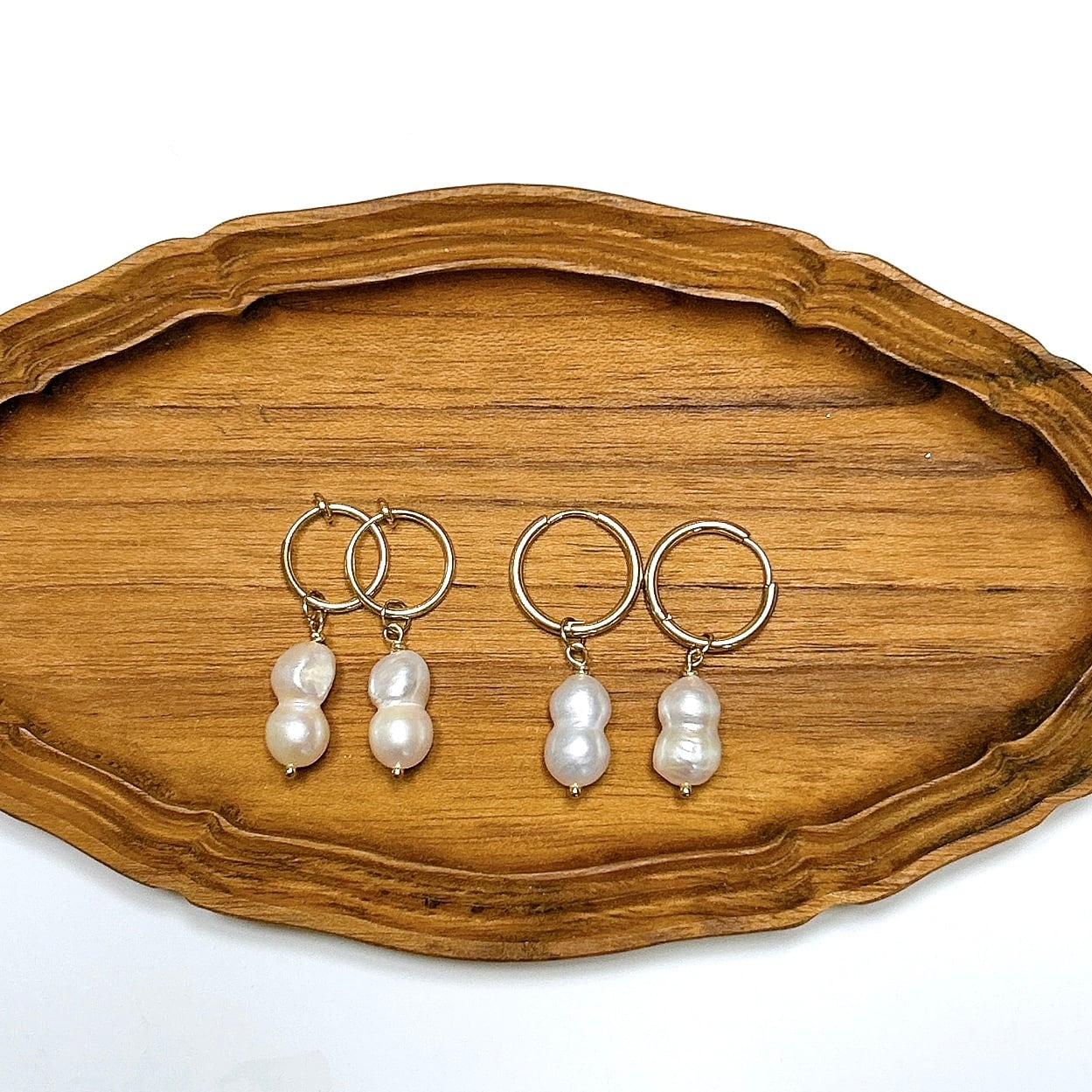 雪だるまのような、ピーナッツのような、ひょうたんのような?ユニークな形が愛らしい、ふたごの淡水パールを取り外しできるフープピアス(イヤリング)に仕立てました。