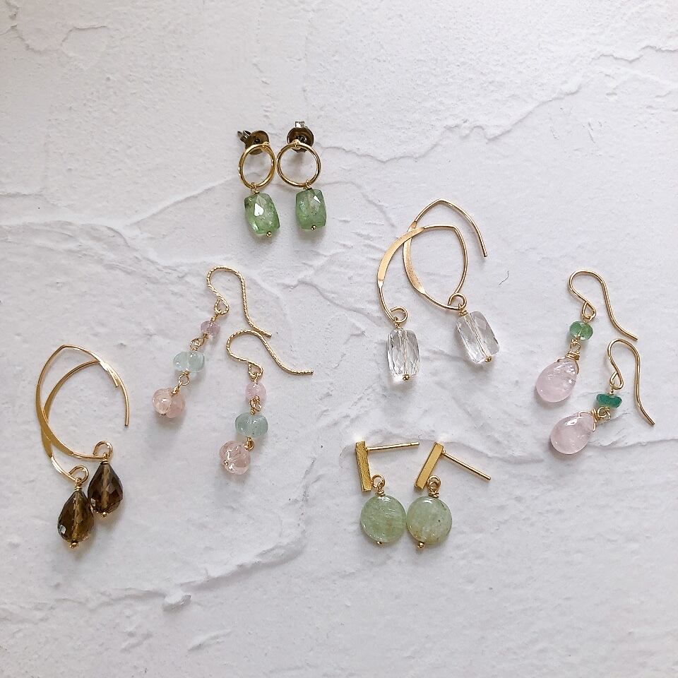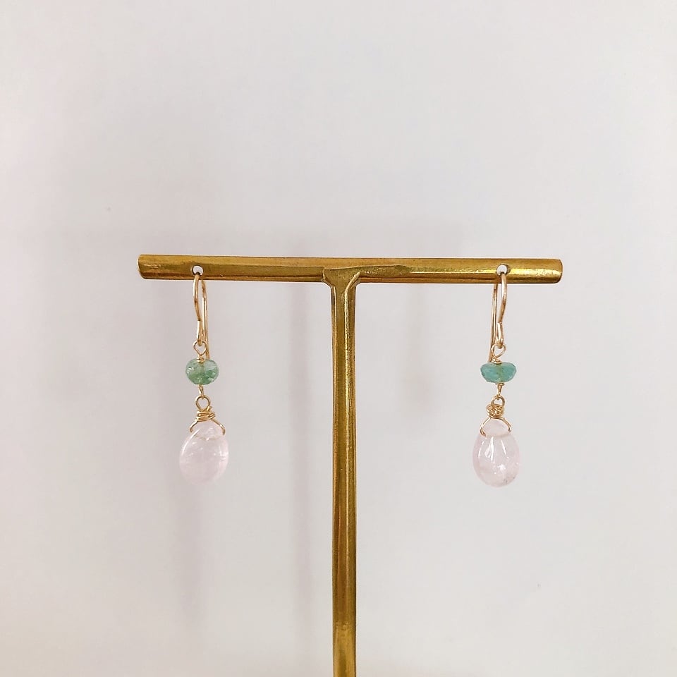 淡いピンクのモルガナイトと、透明感のある上質なザンビア産エメラルドを組み合わせた、葉桜のような色合いのピアスです。