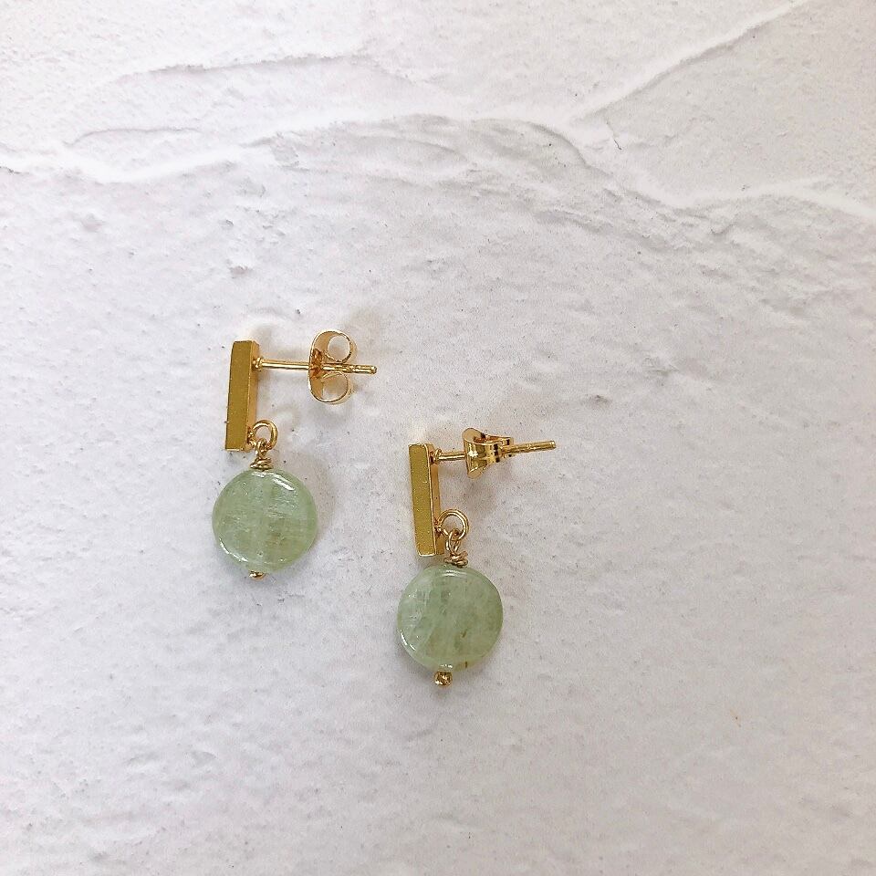 コイン型のグリーンカイヤナイトを、スティック状のピアスパーツにあしらった、シンプルなピアス。