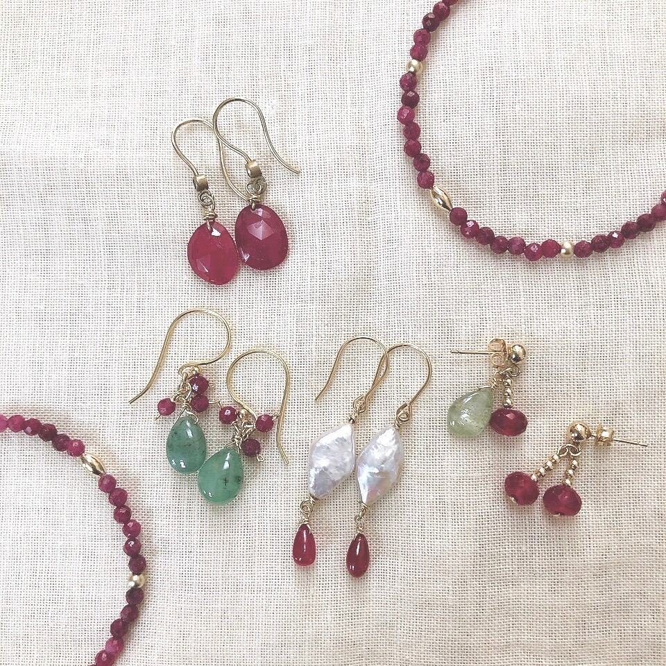 こちらのエメラルドは、atelier narオープン時に、1点もののピアスフックと合わせて販売したものですが、そちらはすぐに売れてしまいました。今回は、三大宝石(ルビー、サファイア、エメラルド)のうちの二つ、ルビーとエメラルドを合わせてシックな色のピアスにしました。