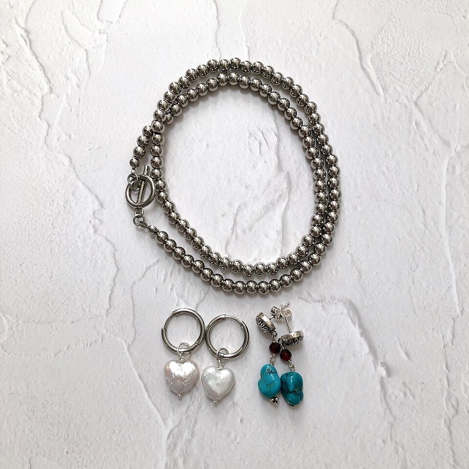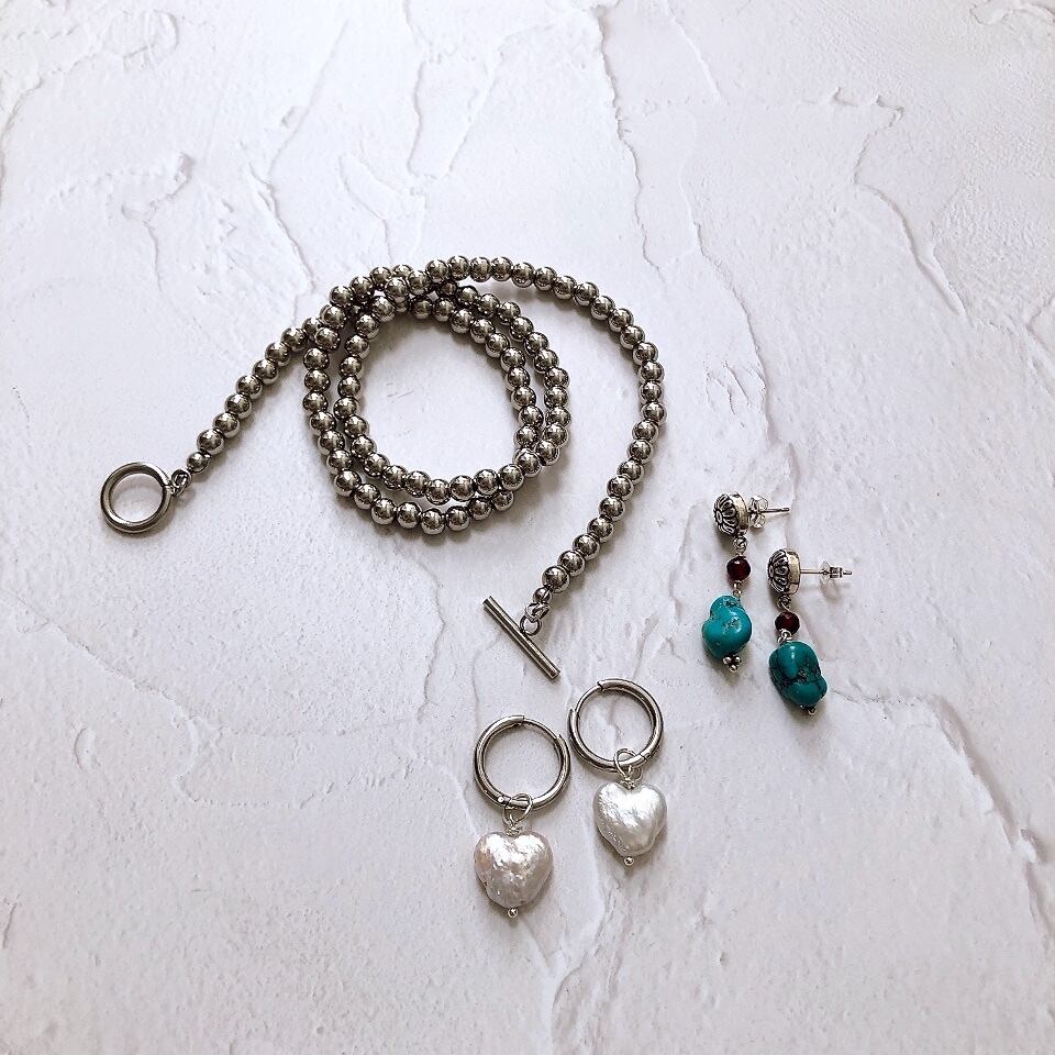 ピアスを華やかなものにしたとき、お洋服がかなりカジュアルテイストのとき、もしくは柄やデザインが主張しているときなど、天然石の色鮮やかなアクセサリーが少し過剰かな?と思うこともしばしば。そんなとき、シルバーやゴールド一色のシンプルなネックレスは本当にお役立ちです!華奢なチェーンネックレスも素敵ですが、程よく存在感のあるボールネックレスに仕立てました。