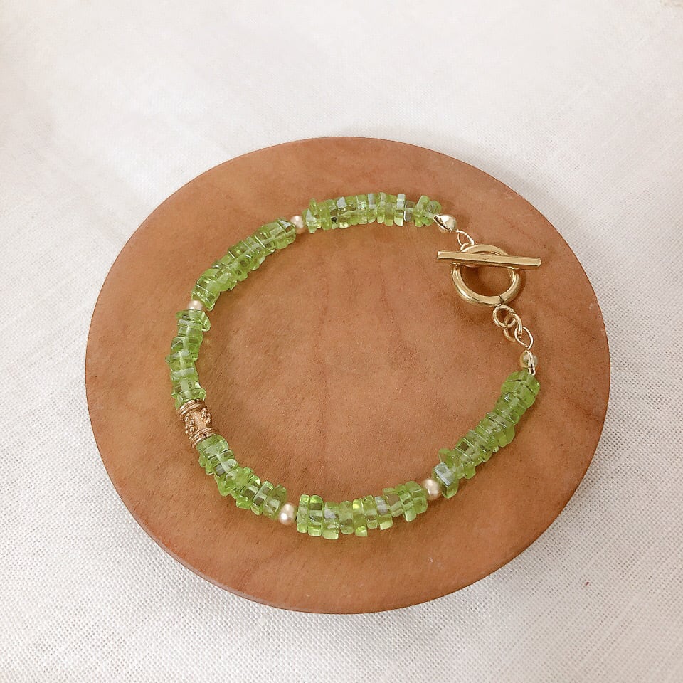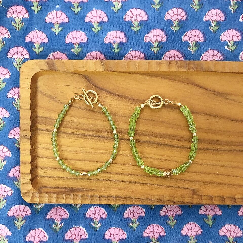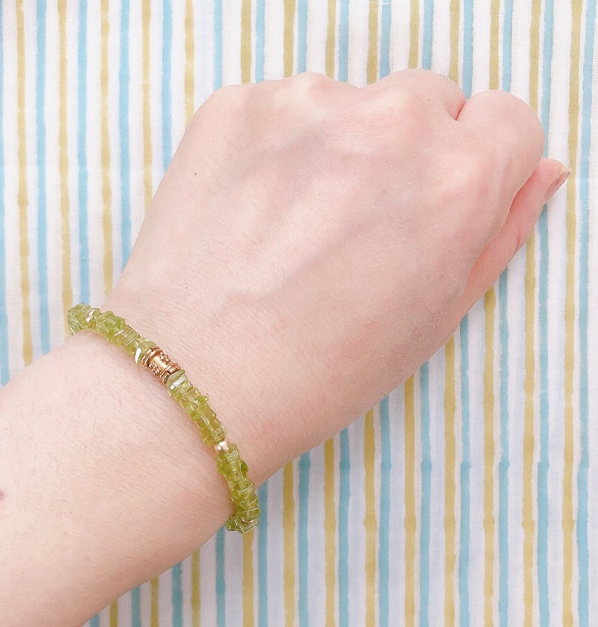 8月の誕生石でもあるペリドットのヘイシビーズでお作りした、天然石の魅力がたっぷり味わえるブレスレット。ヘイシビーズとは小さいディスク型(管状)の平たいビーズのことで、小さくて薄いぶん、同じ長さでもたっぷりビーズが重なっていますので、よりぎゅっと詰まったボリューム感のある美しさが魅力的です。