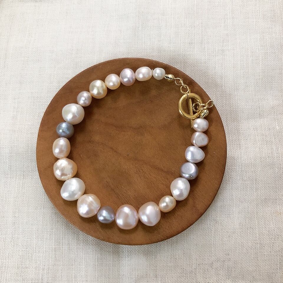 ホワイト、ライトオレンジ、ライトグレー、ライトピンクに染められた、大小さまざまな大きさと形のバロック淡水パールをランダムに繋いだブレスレット。