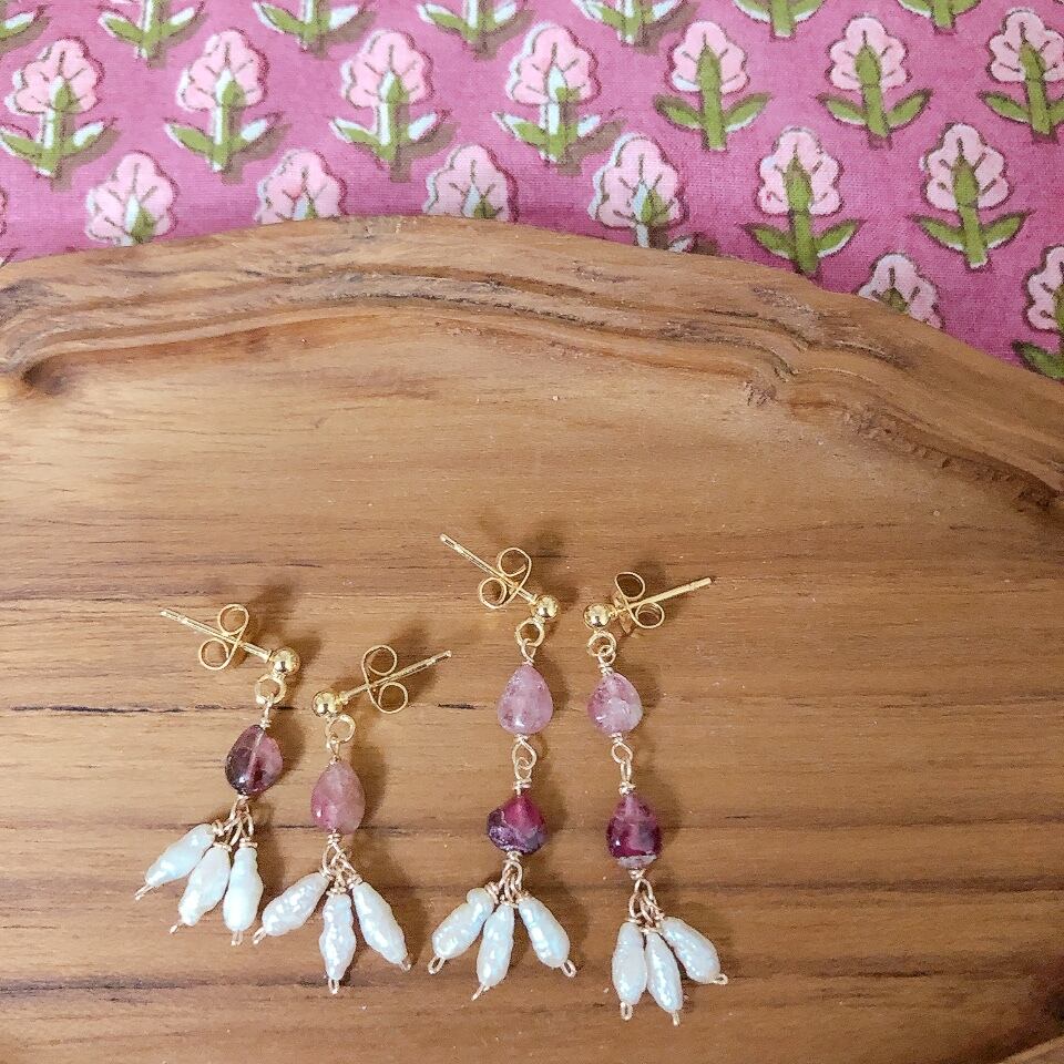くすみカラーが魅力的な小粒ピンクトルマリンのドロップに、ライス型の細長い淡水パールを3つ、しゃらしゃらと下げました。とっても華奢で、軽い付け心地の軽やかなピアスです。