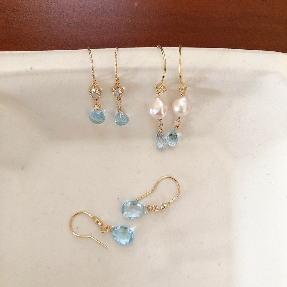 3種類ご用意しましたが、どれも私が大切に取っておいてたオールドストックのトパーズばかりです。こちらは、小さなホワイトトパーズのチャームと、オニオンカットの小さなスカイブルートパーズを合わせたピアス。ピアスフックもキラキラ輝くグリッタータイプのものにしました。