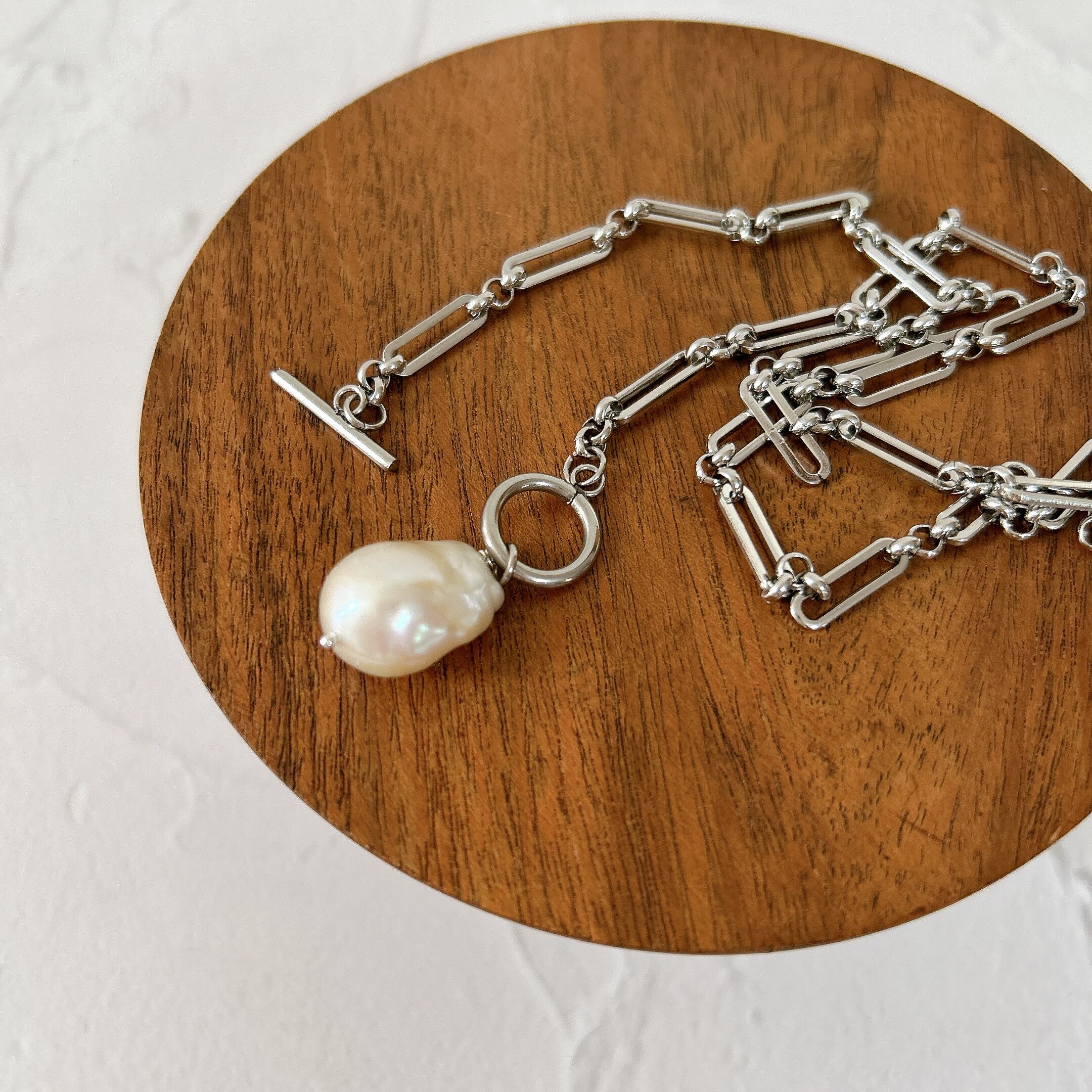 近頃よく見かけるようになった、チャンキーチェーンとバロックパールのネックレス。よくあるデザインではありますが、チェーンの長さやパールの大きさなど、こうだったらいいなという私の理想を詰め込んだネックレスです。