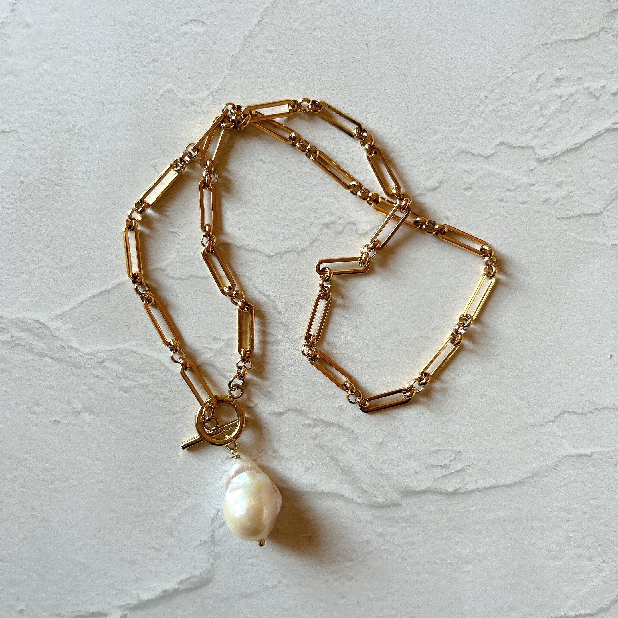 近頃よく見かけるようになった、チャンキーチェーンとバロックパールのネックレス。よくあるデザインではありますが、チェーンの長さやパールの大きさなど、こうだったらいいなという私の理想を詰め込んだネックレスです。