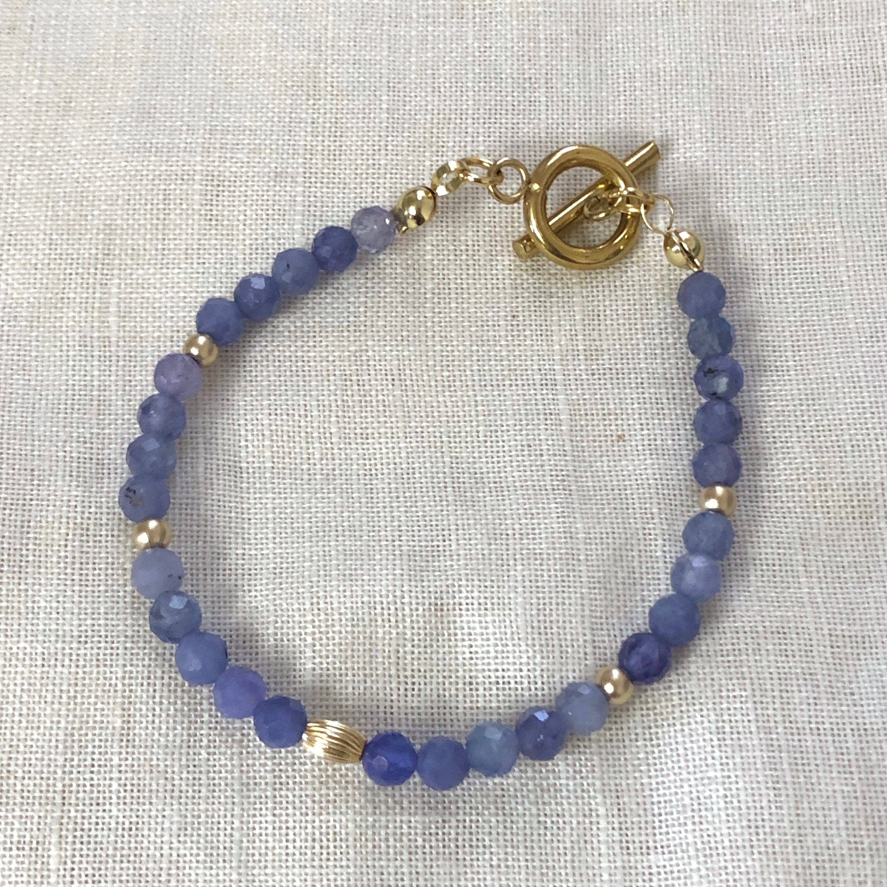ブレスレットに使っている4mmボールカットの美しい石が1連だけ手に入りましたので、各サイズ1点ずつですがスペシャルなブレスレットに仕立てました。やや淡めの青紫色が上品で、合わせやすいお色です。中心のゴールドビーズも、アンティーク風のコルゲートビーズ(筋入りのビーズ)を使っています。