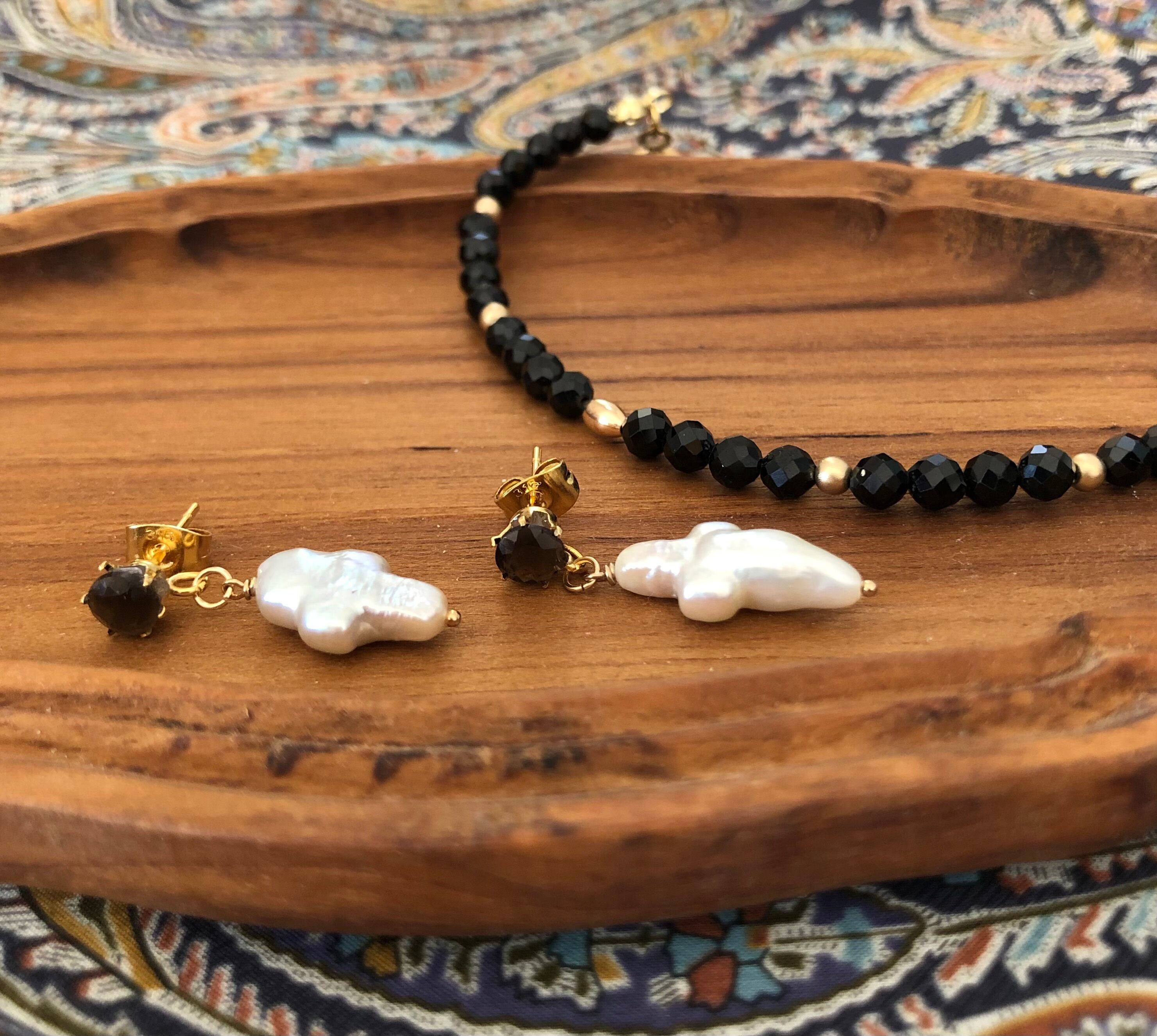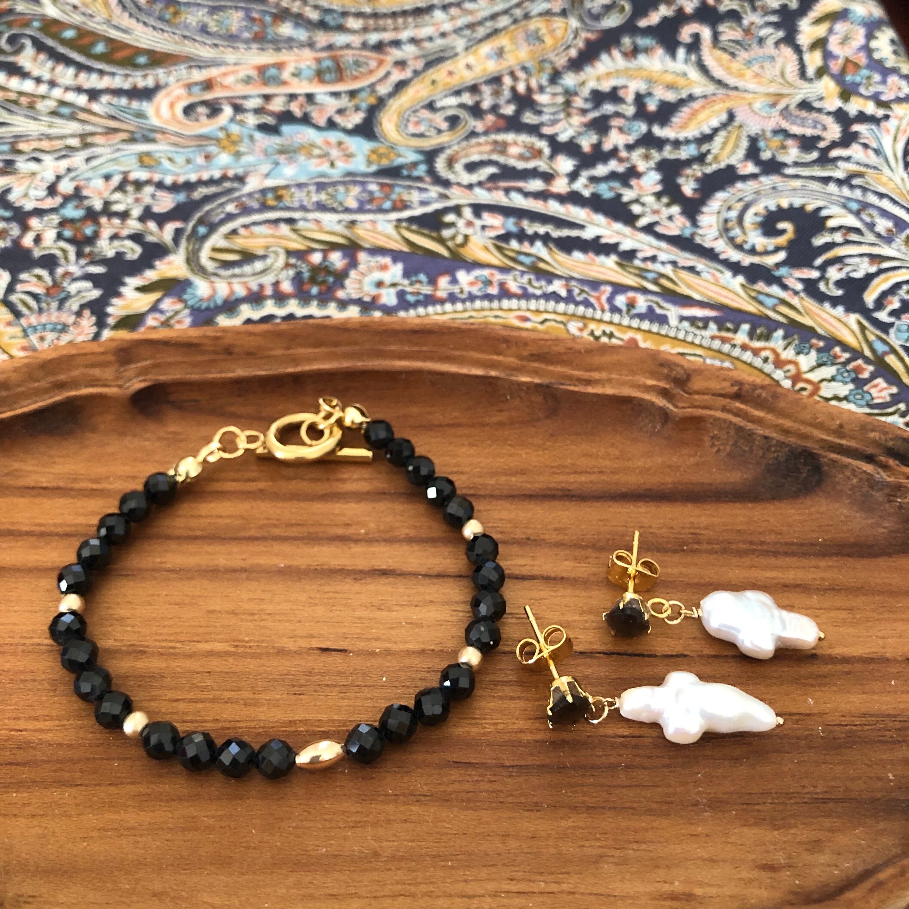 <素材>天然石(ブラックスピネル)、K14GF(ゴールドビーズ)、サージカルステンレス(留め具)