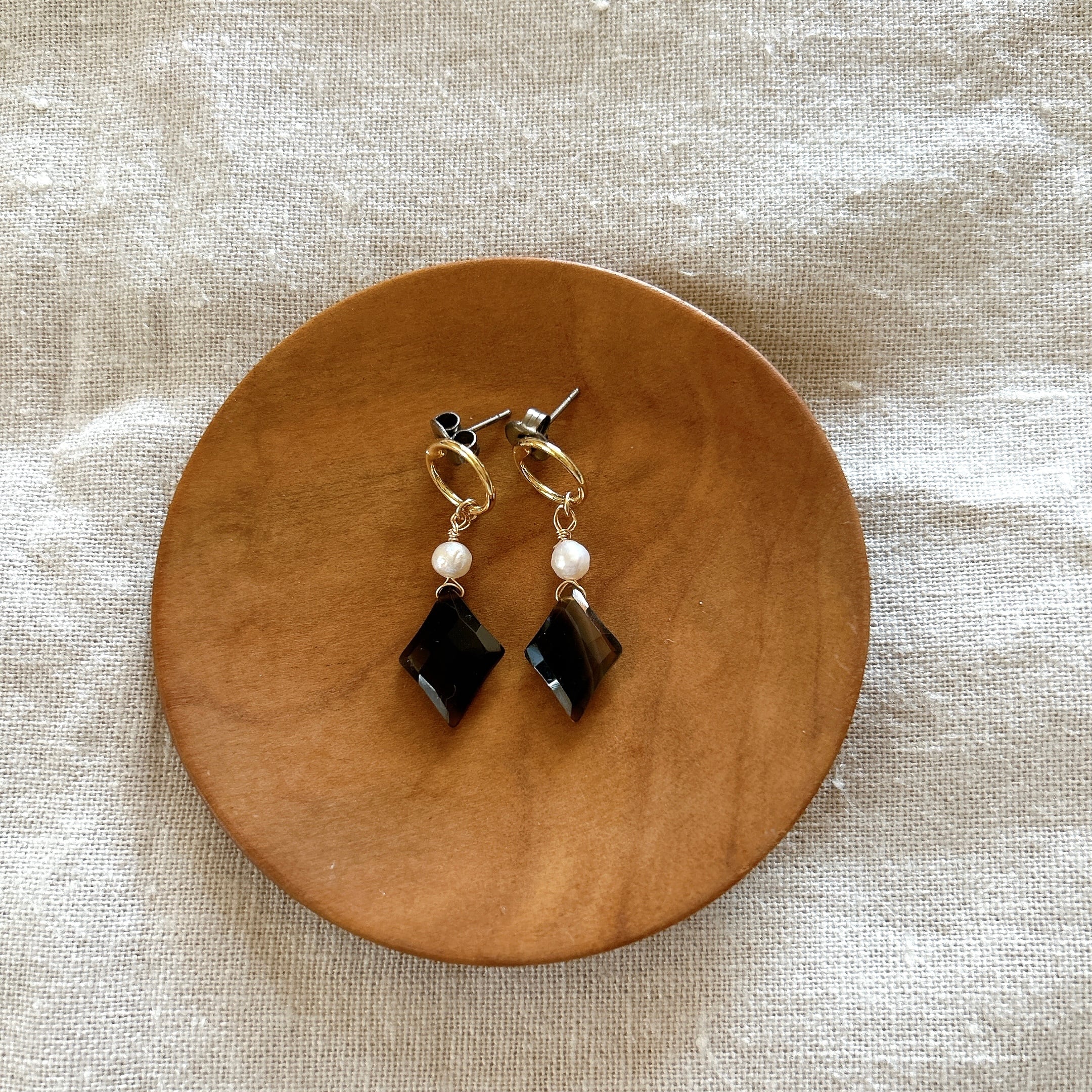 細かなカットが入った菱形のアゲート(瑪瑙)のビーズが少しだけ入りましたので、定番のサークルピアスにお仕立てしました。