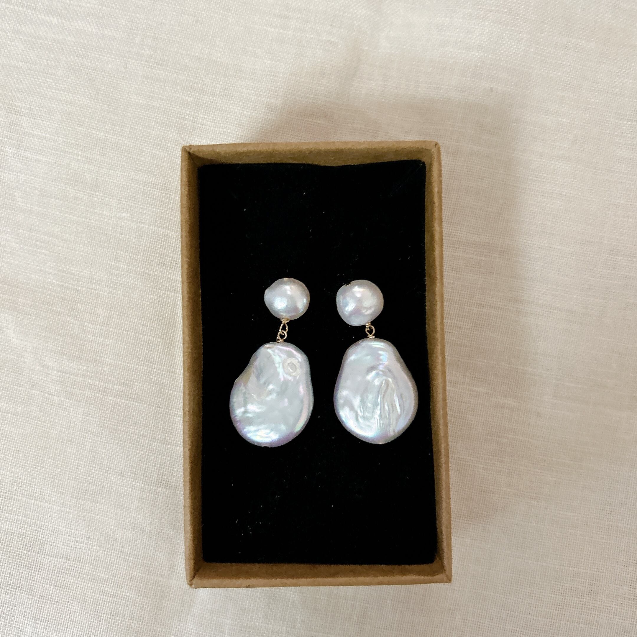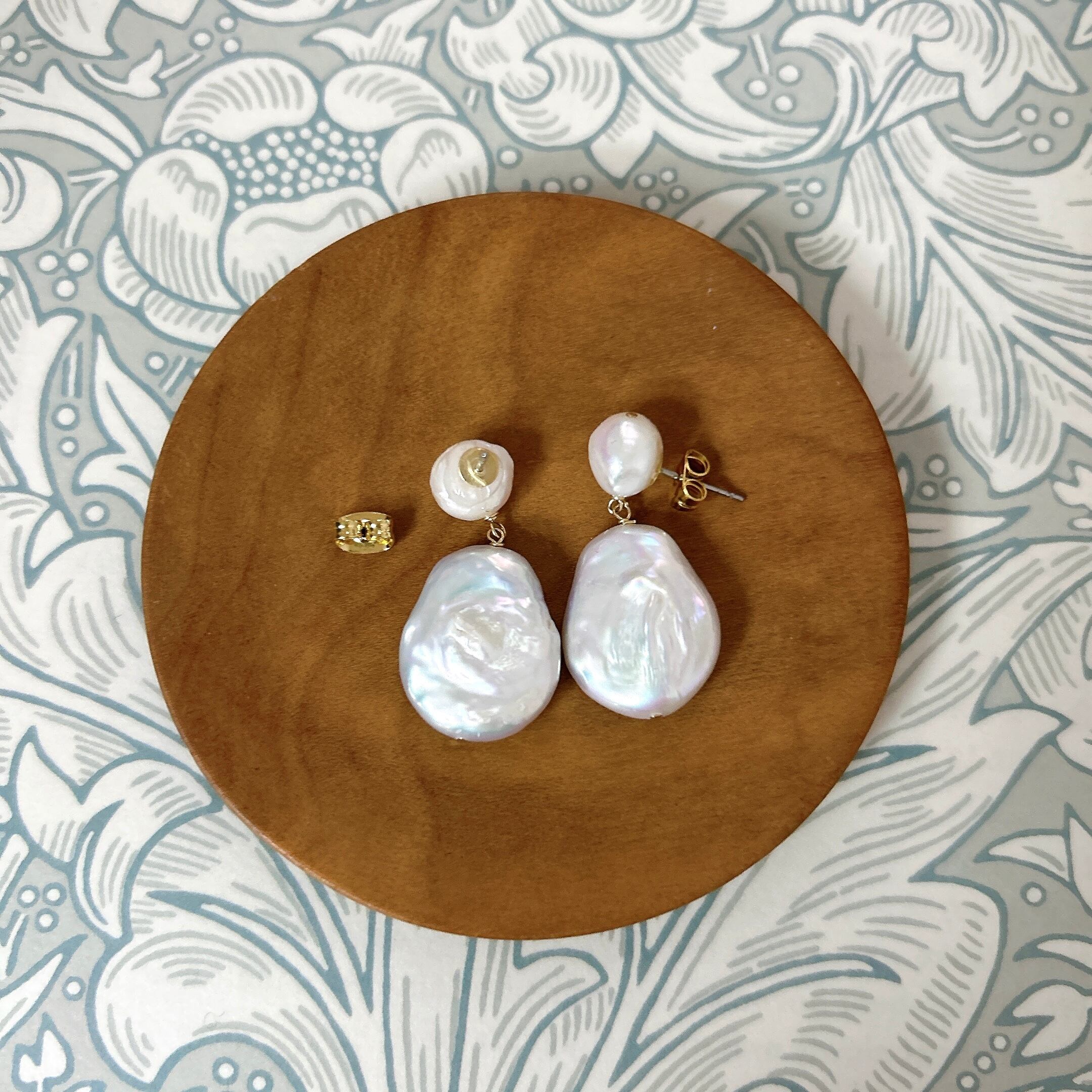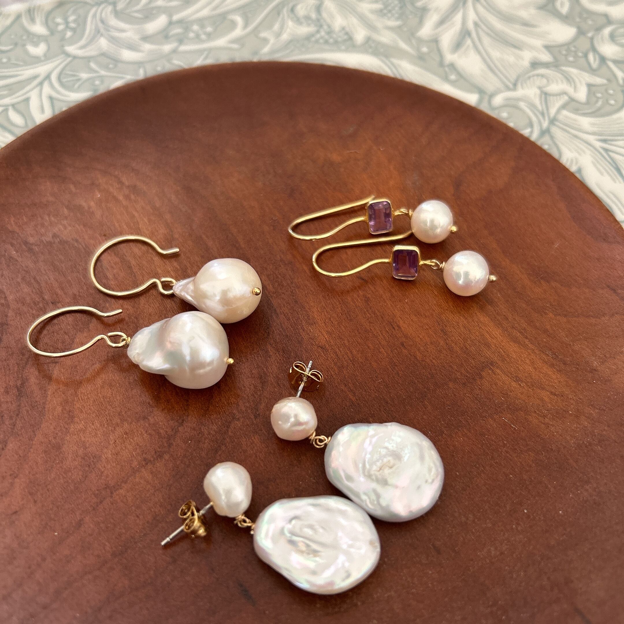 珍しい大ぶりな雫型の淡水パールを1組だけ手に入れましたので、個性的な形をどんなデザインだとうまく活かせるかなと考え、スタッズ自体にころんとしたバロック淡水パールを付けてみました。