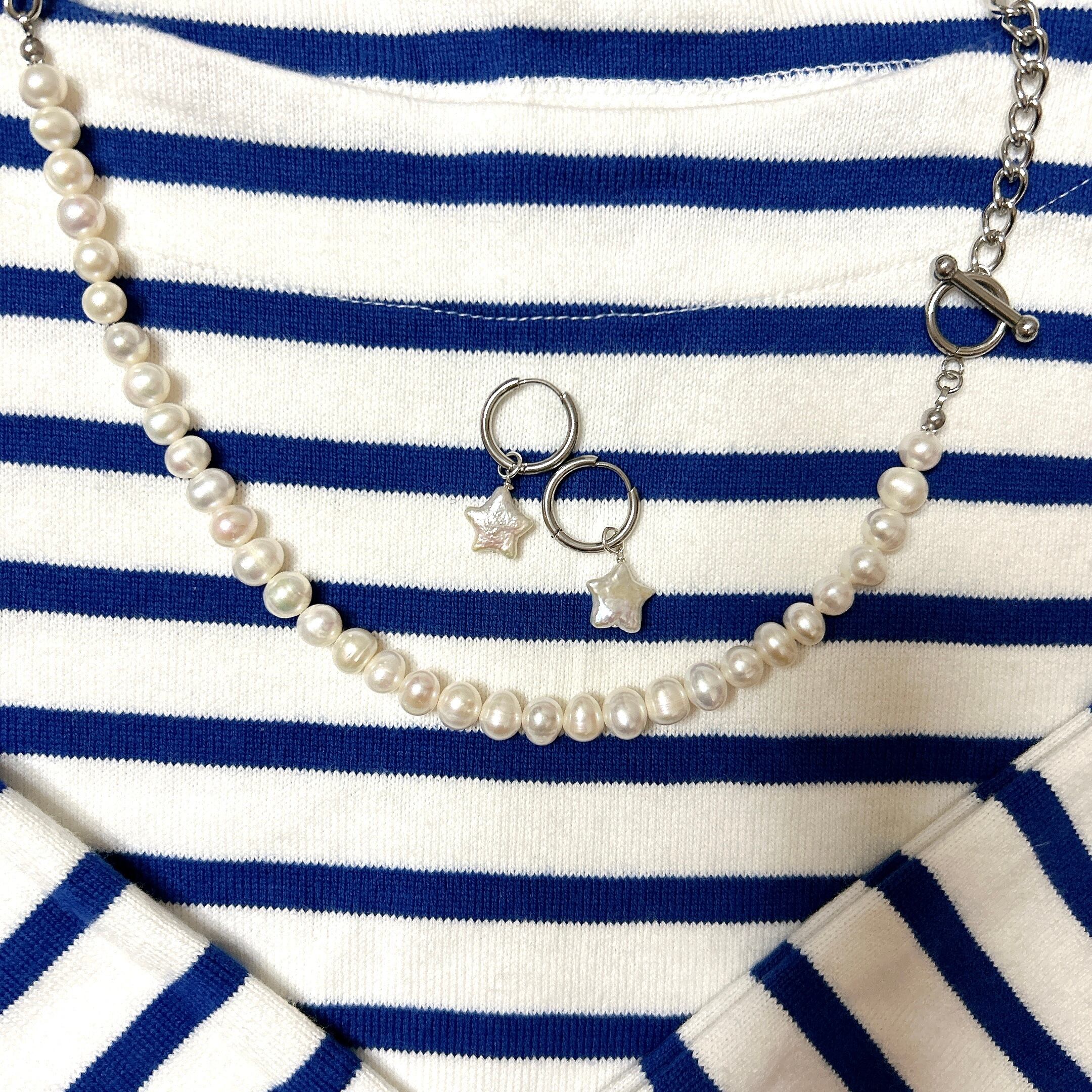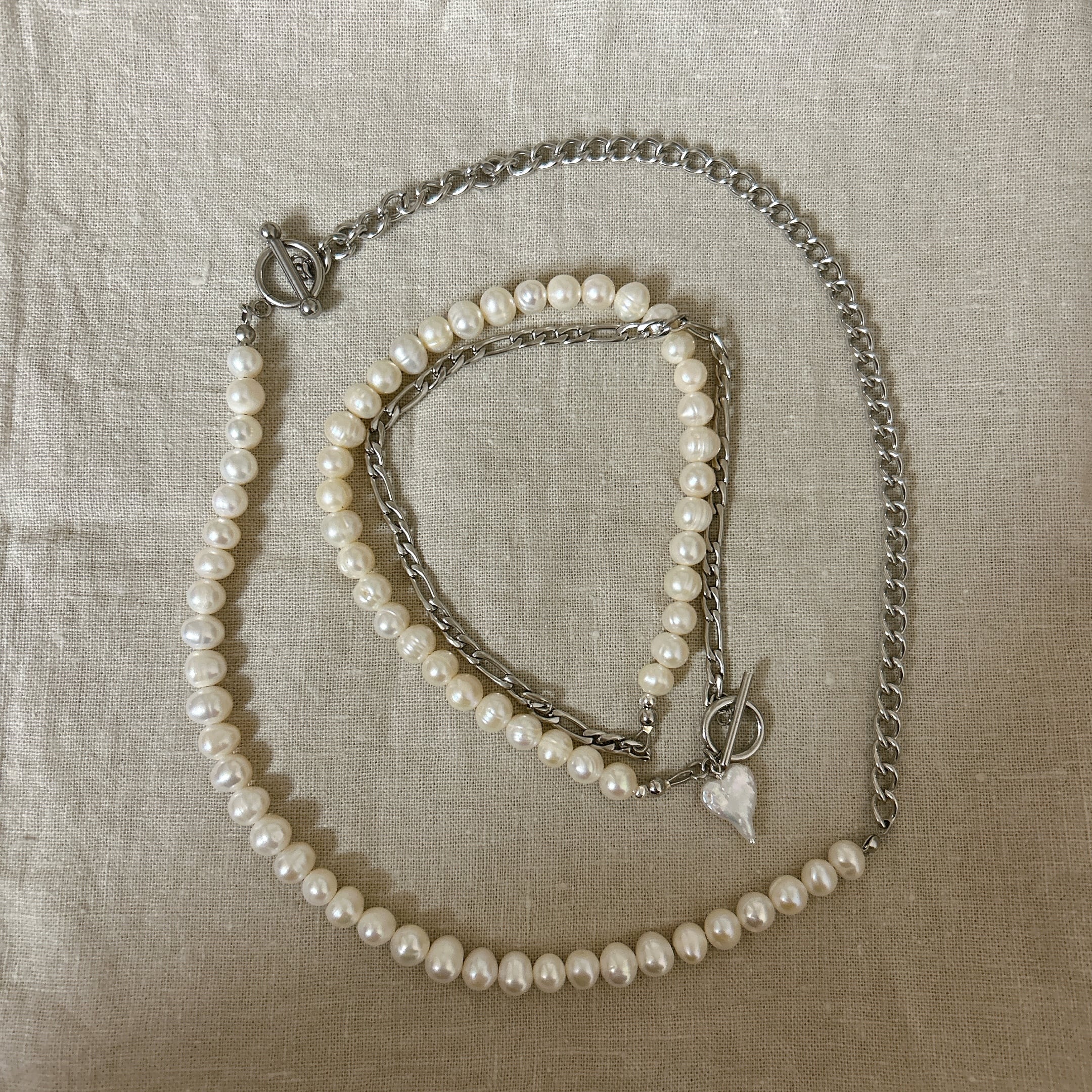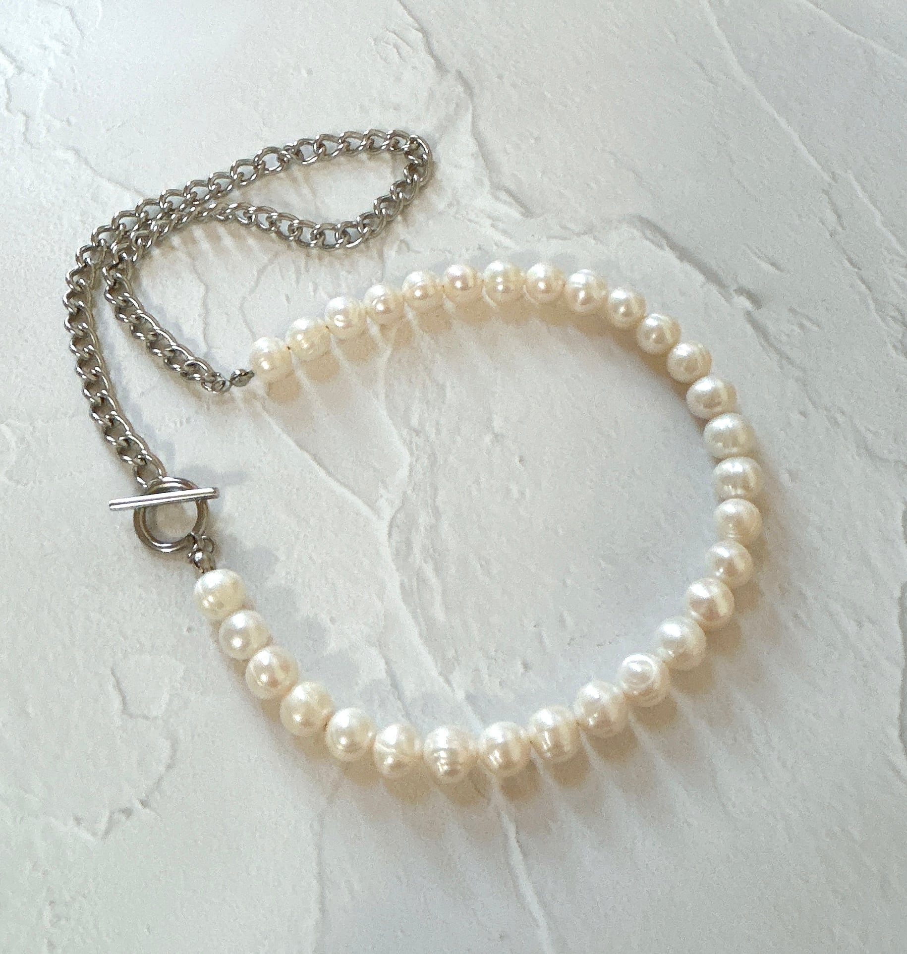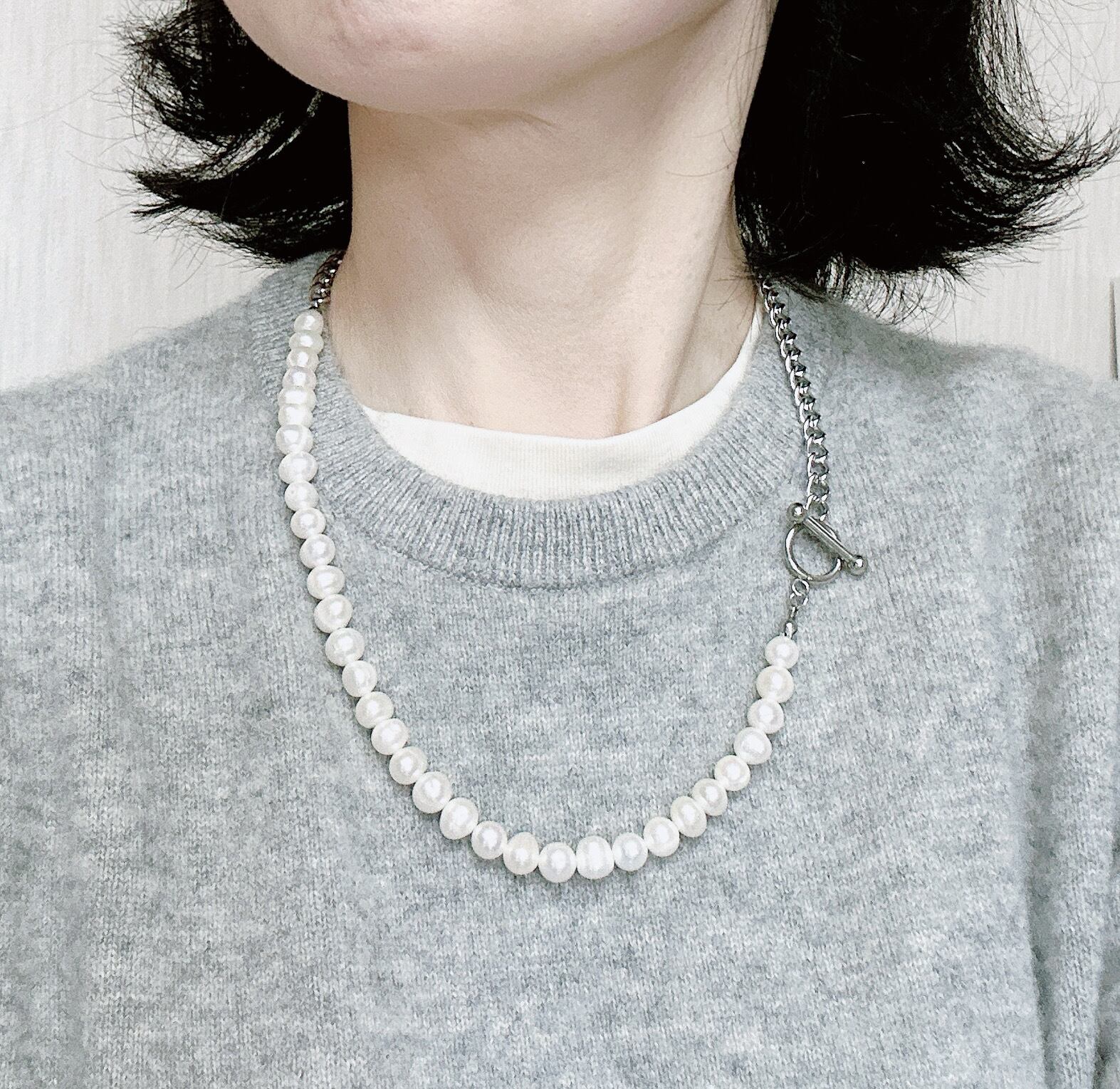 カジュアルに着けられる、シルバー(サージカルステンレス)とコンビの淡水パールネックレス。
