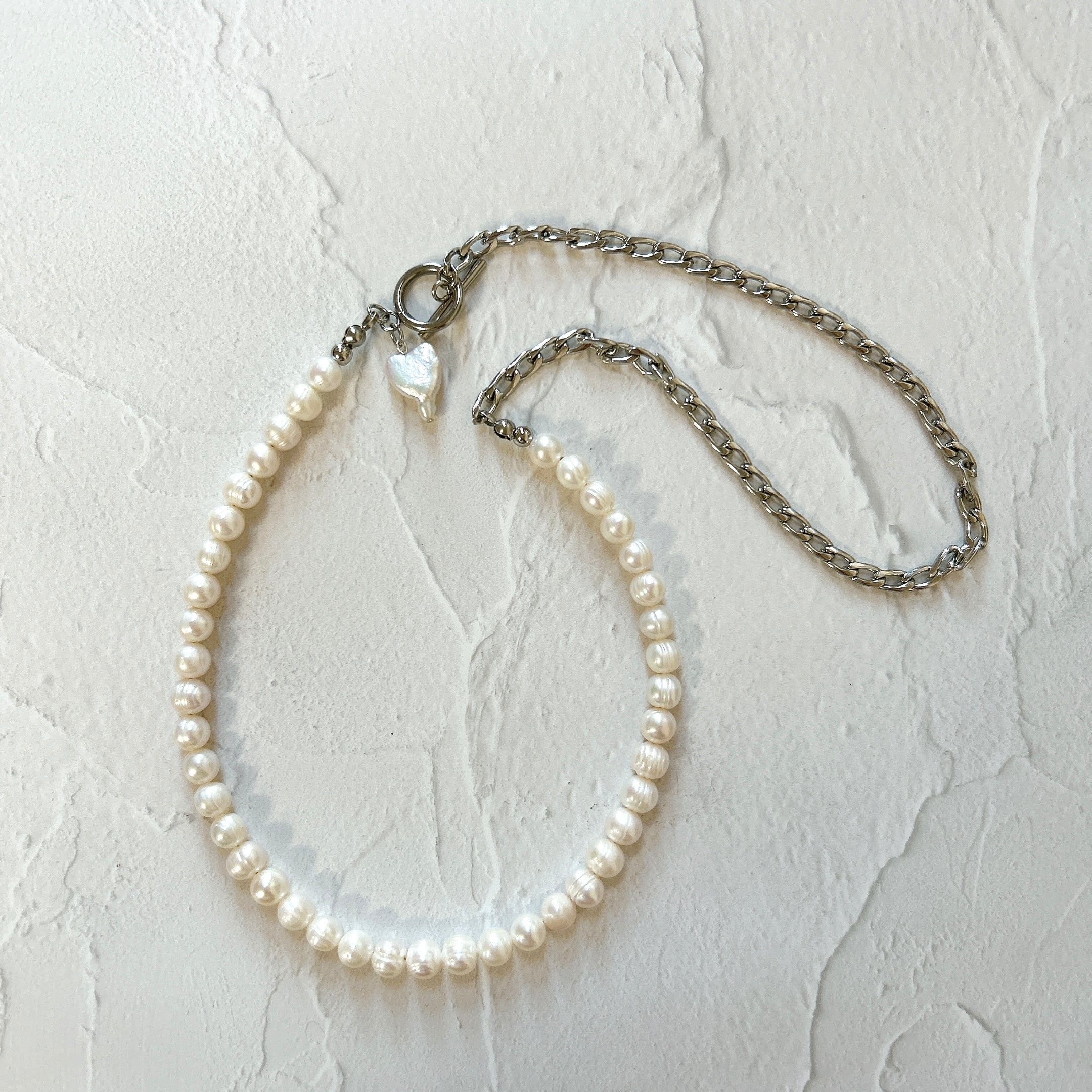 カジュアルに着けられる、シルバー(サージカルステンレス)とコンビの淡水パールネックレス。アクセントに、ピアスでも人気のハートパールをマンテルに付けてみました。